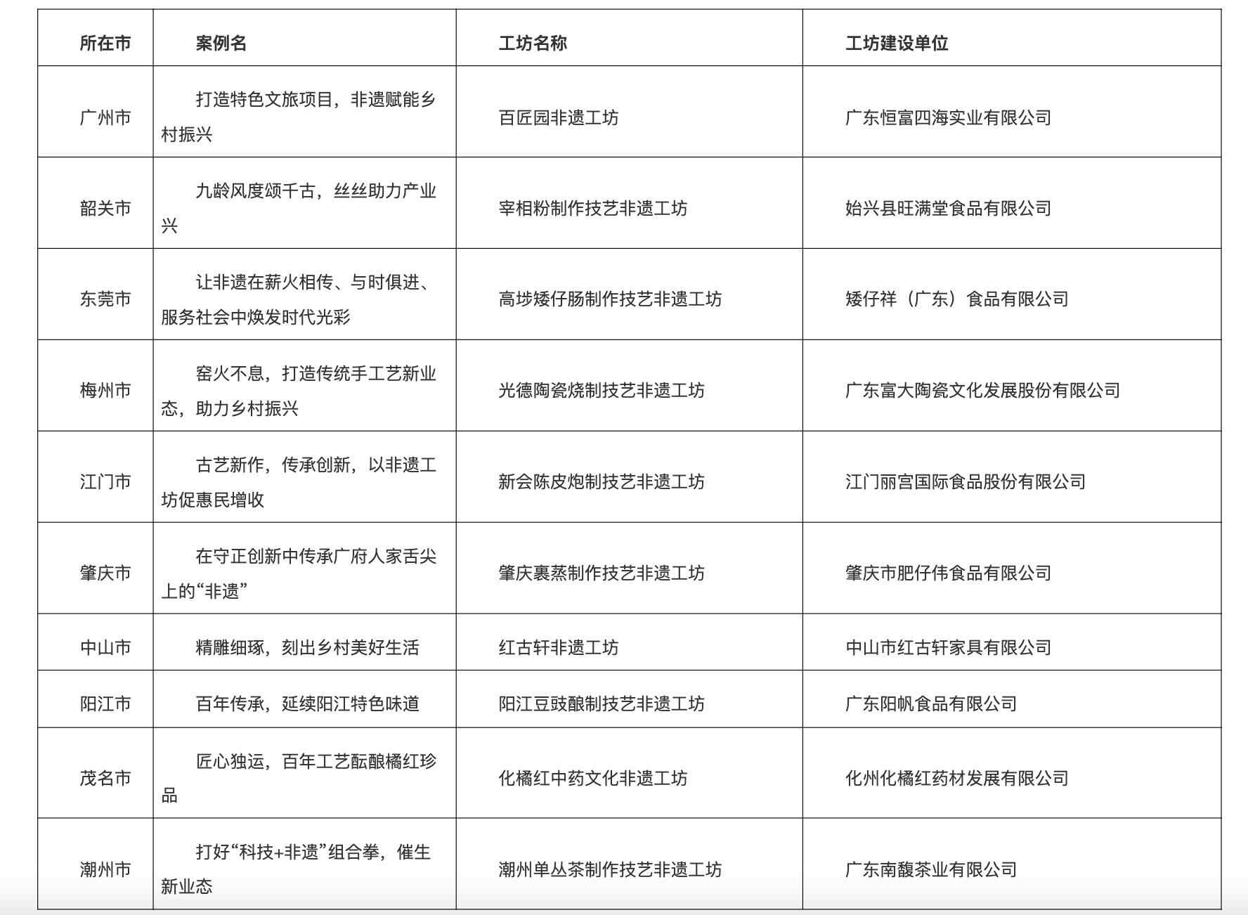 包括广州市百匠园非遗工坊、韶关市宰相粉制作技艺非遗工坊、江门市新会陈皮炮制技艺非遗工坊在内的10家非遗工坊入选优秀!