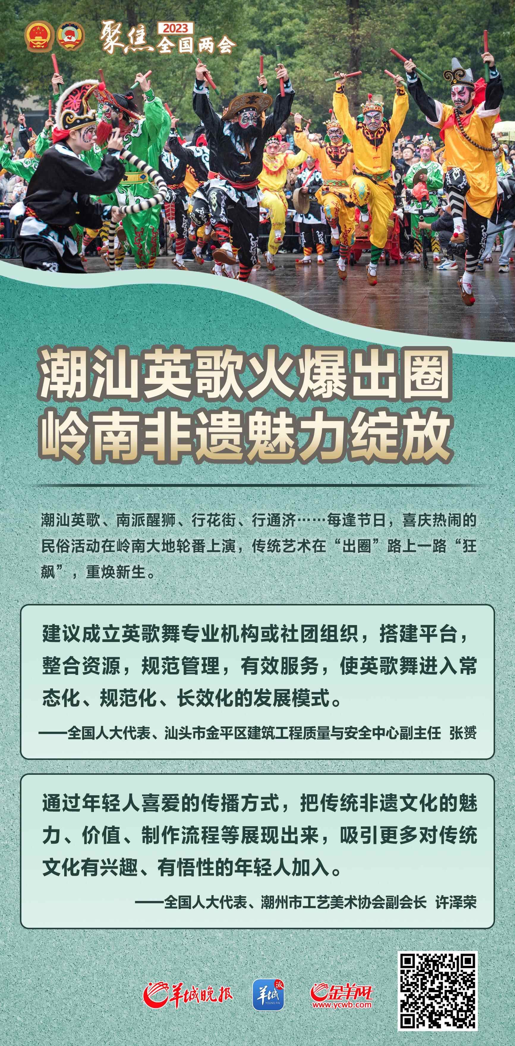 “今年春节期间,潮汕英歌舞火爆‘出圈’,作为来自汕头的代表,我感到很骄傲,也很自豪。”全国人大代表、汕头市金平区建筑工程质量与安全中心副主任张赟说,英歌舞排山倒海般的气势,肆意喷涌的感情,无论是舞者还是观众,都能沉浸其中。在她看来,英歌舞的火爆,让大家受震撼的不只是它独特的表演形式,而是它所表现出来的撼人心魄的力与美,“它已不仅仅是一种舞蹈,一种民俗,还是潮汕地区文化传统的沉淀,蕴涵着深厚的岭南文化精神。我们应该传承这样的精神,这是将英歌舞传承弘扬发展的最好方式。”张赟说。