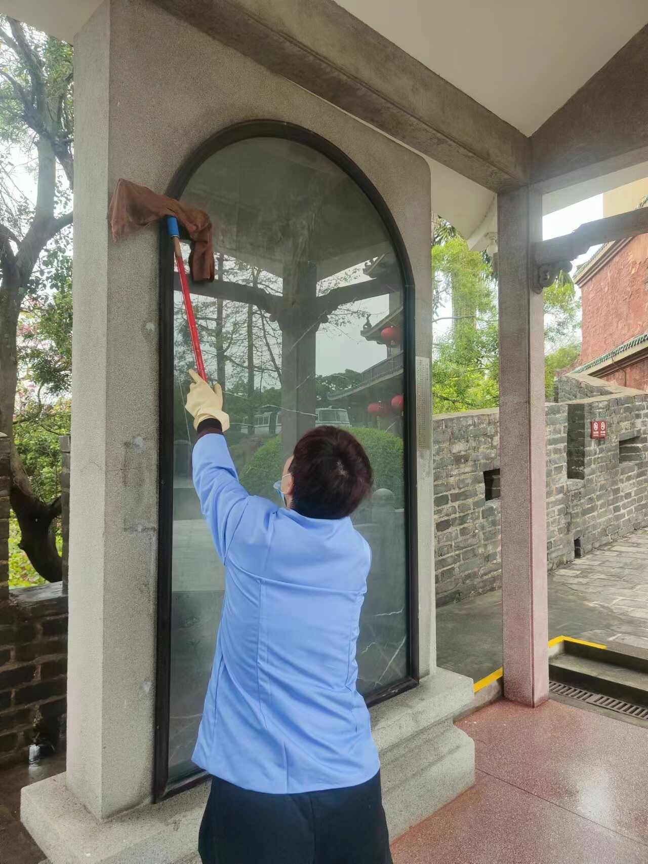 工作人员擦拭镇海楼户外文物保护罩上的水珠