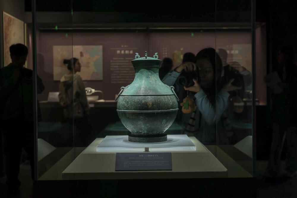此次展览中,“中山三器”中的中山王圆壶现身展厅。据策展人何少伟介绍,中山王圆壶的圈足上刻有铭文23字,记录了壶的重量和制壶工匠的名字。壶腹上刻有182字,铭文内容是追颂先王中山王的一篇悼词,歌颂了先王的慈爱贤明,赞扬了中山国相邦司马赒率军攻伐燕国所取得的成果,具有重要的史料价值。