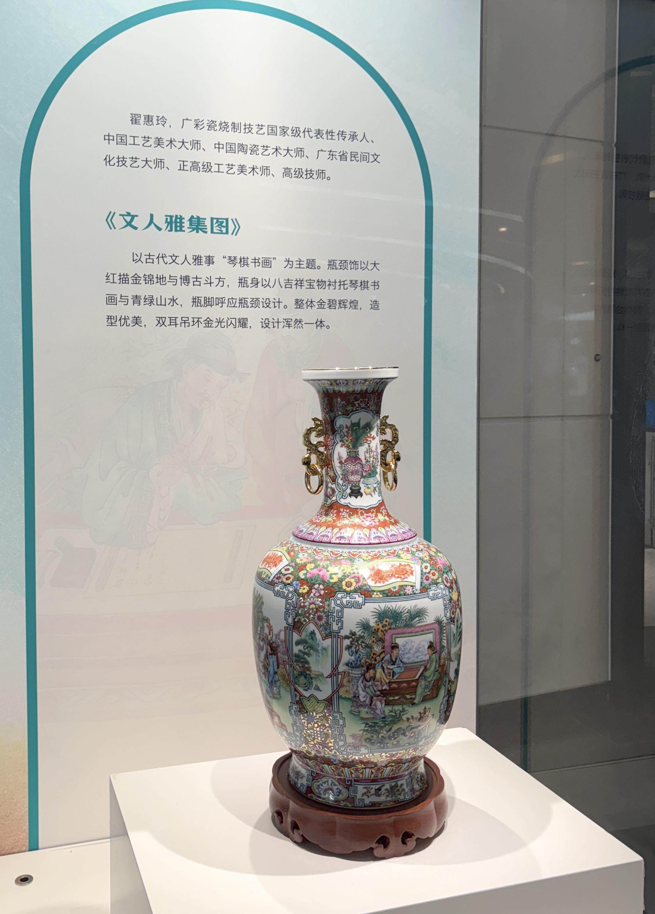 其中,广州的广彩瓷烧制技艺国家级代表性传承人翟惠玲创作的《文人雅集图》以古代文人雅事“琴棋书画”为主题,精妙地勾勒出岭南文脉的深厚底蕴。