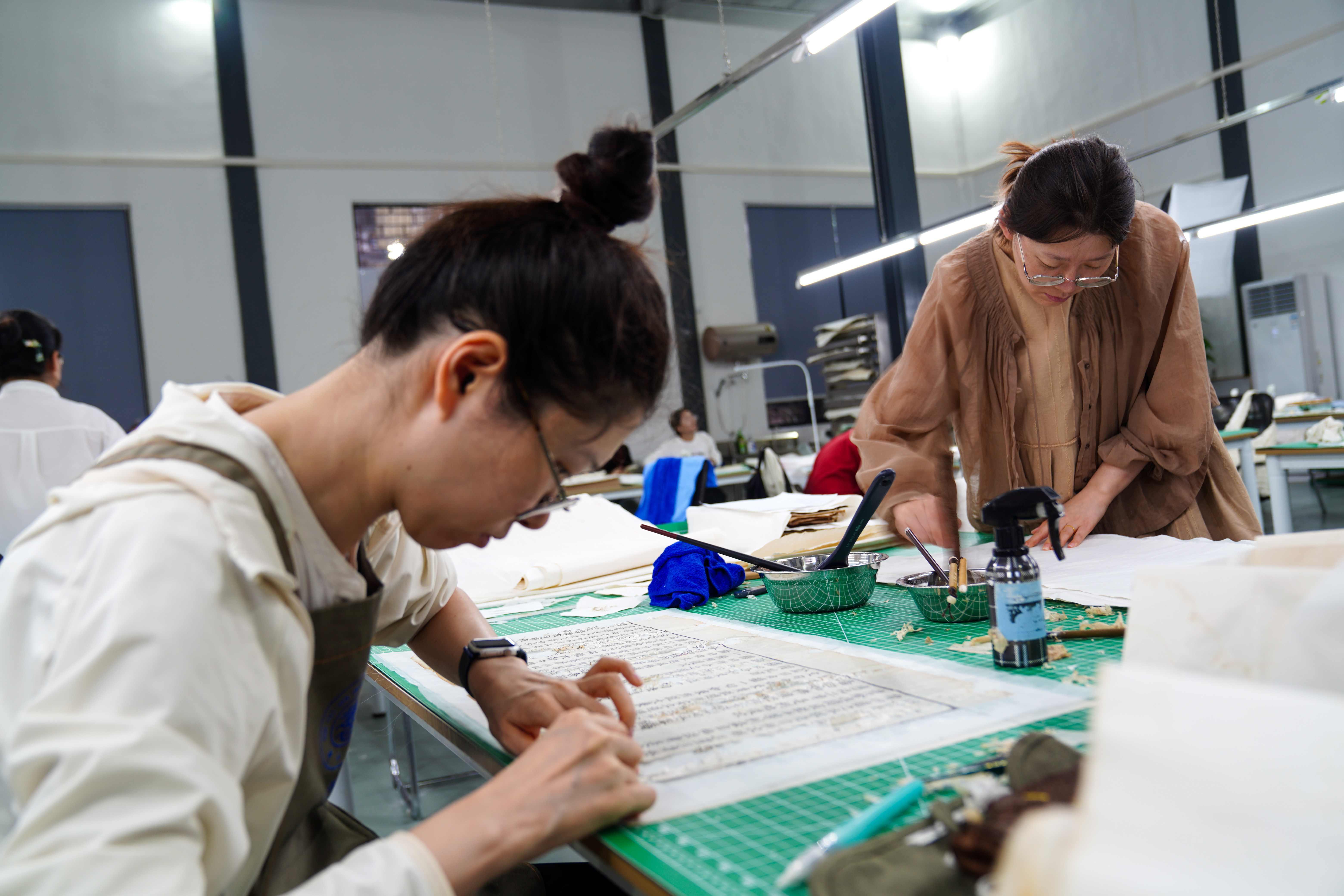 据介绍,本期研修班采取差异化修复策略,对不同破损程度的经卷展开修复,同时更加注重修复技术的标准化与科学化——对于重度破损的佛经,采用纸浆补书机与手工滴补纸浆修复技术相结合的方法;对于中轻度破损的佛经,如局部虫蛀或小范围撕裂,则采用传统的手工修补方式。