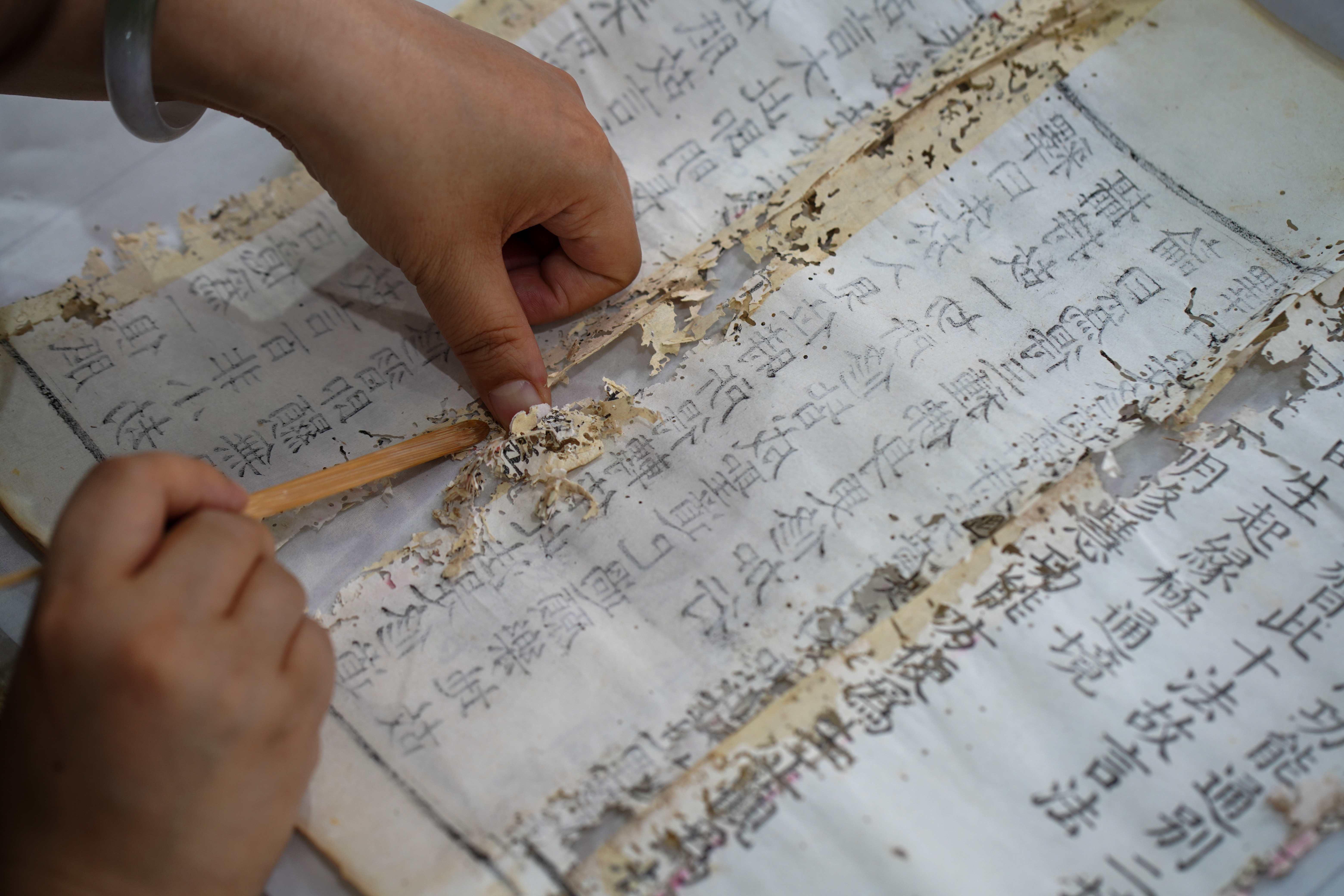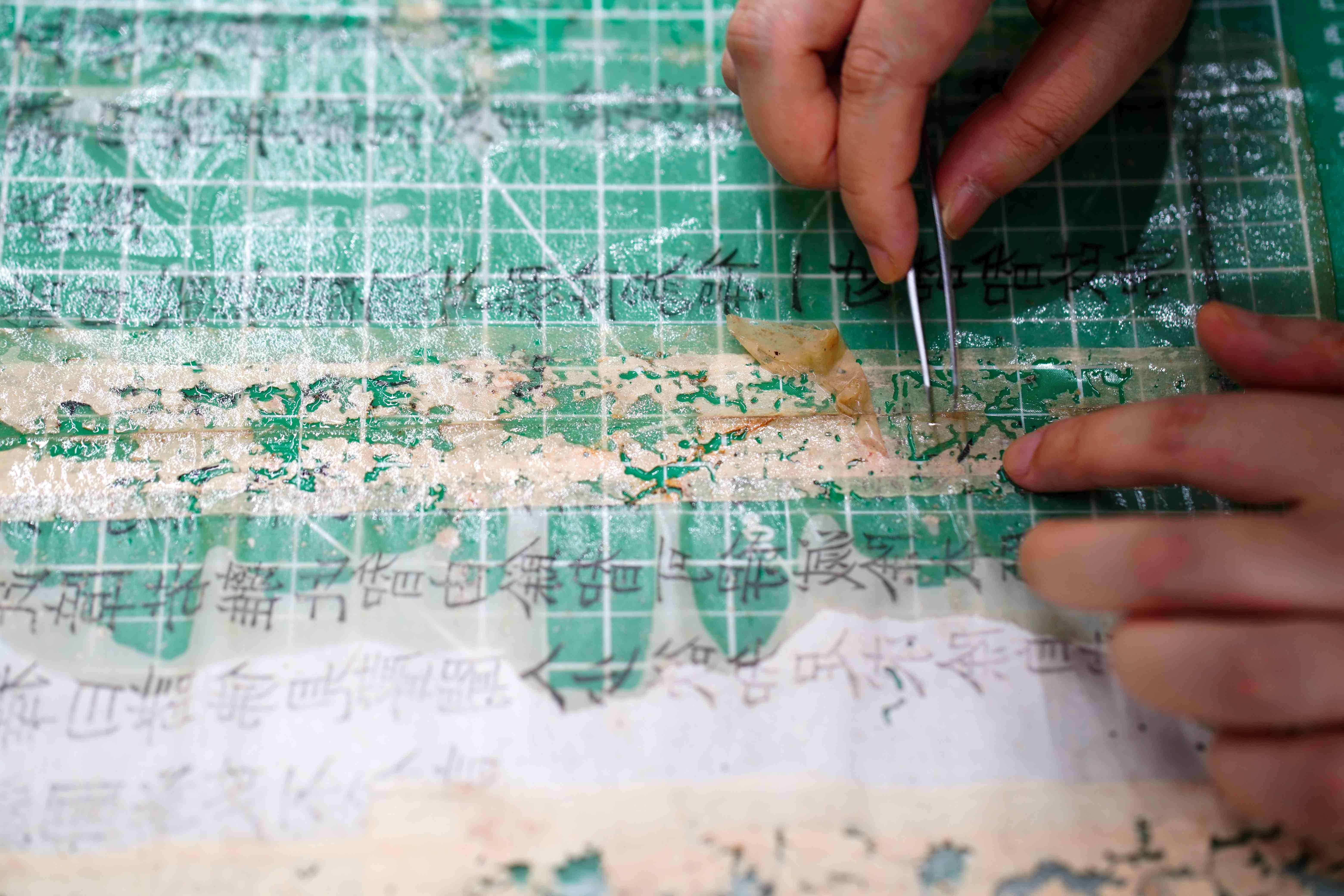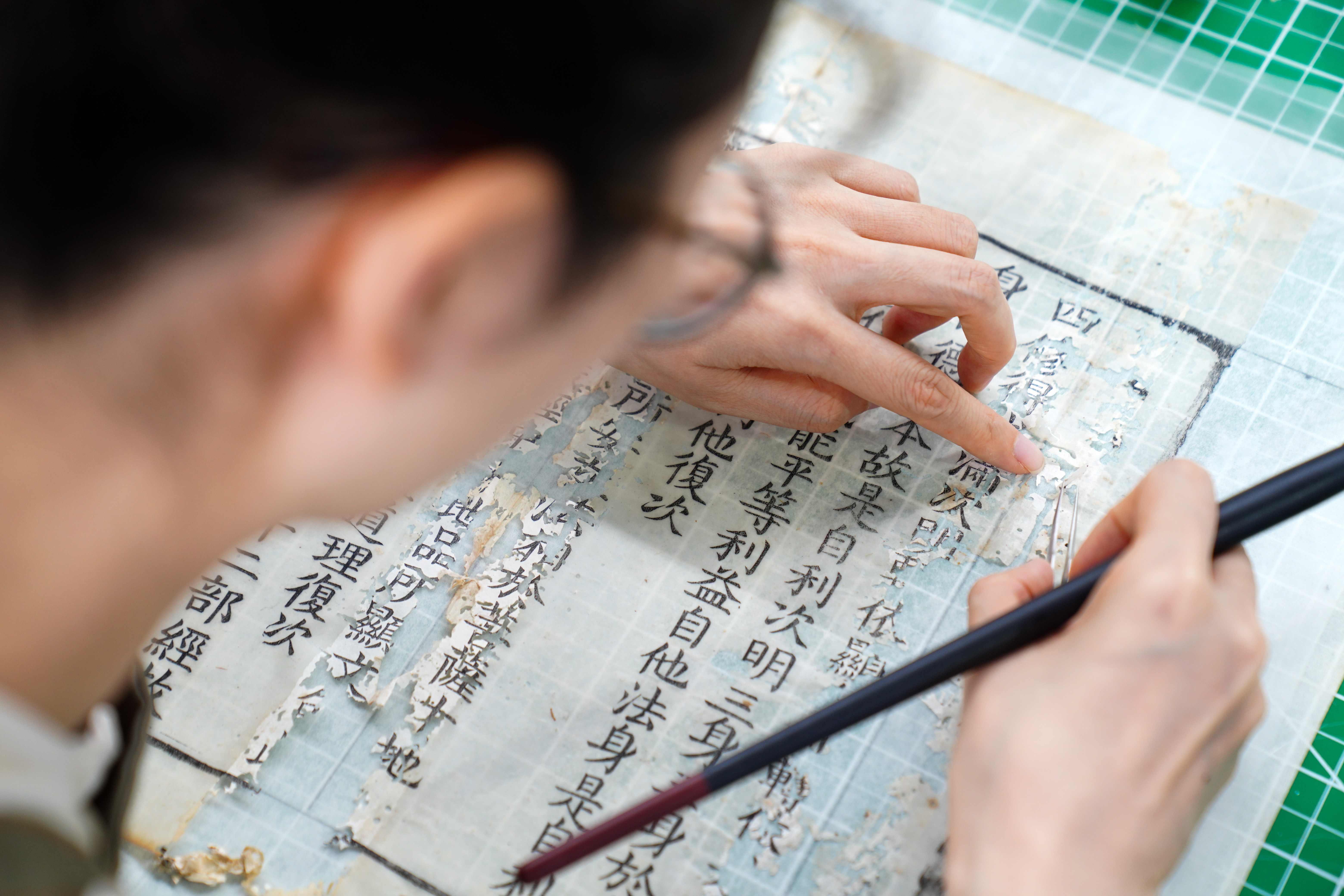 工作台上铺着泛黄的经卷,有些地方已经被虫蛀得千疮百孔,成碎片状;有些则因为受潮而粘连紧密,难以分离。专业学员们紧张而又有条不紊地进行着修复工作。记者身在其中,不敢高声言语,以免打扰这一场“与历史的对话”。
