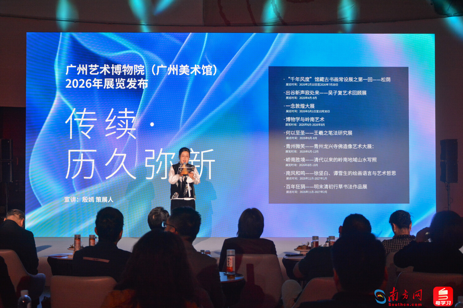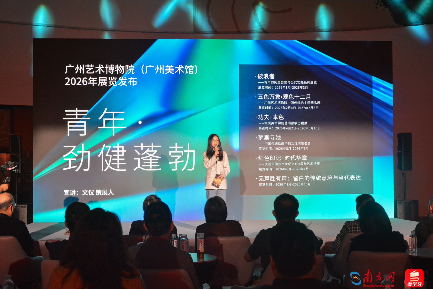 活动现场,广州艺术博物院(广州美术馆)通过“少年·如日初升”“青年·劲健蓬勃”“传续·历久弥新”三大篇章,正式发布了2026年度展览计划,陆续推出18场涵盖古今、维度多元的艺术展览。