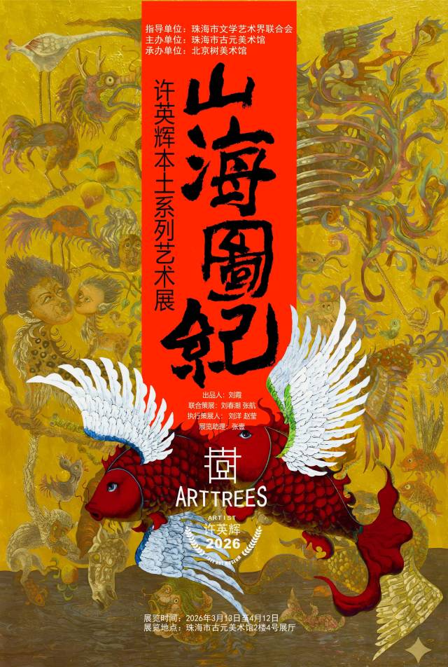 看点:华夏文明的根系,深扎于广袤的泥土与奇幻的神话之中,艺术家许英辉的《山海图纪》系列,正是沿着这条根系溯源而上的漫长探索。回望艺术家《山海图纪》系列在不同时期的主题:“万象有鱼”“鲲鹏变”“混沌”“凤翥”“世与界之树”“创世之痕”“繁花”等等系列。其艺术面貌从质朴狂野的图腾再现,到自由写意的神采飞扬,但其精神内核始终未变。许英辉以中国传统民间美术的造型法则为骨,以《山海经》的洪荒宇宙为魂,将壁画、剪纸、木版年画中的原生力量,转化为具有当代视觉张力的绘画语言。他画的不仅是奇珍异兽,更是中国古人对宇宙万物时那份质朴的敬畏与浪漫的想象。
