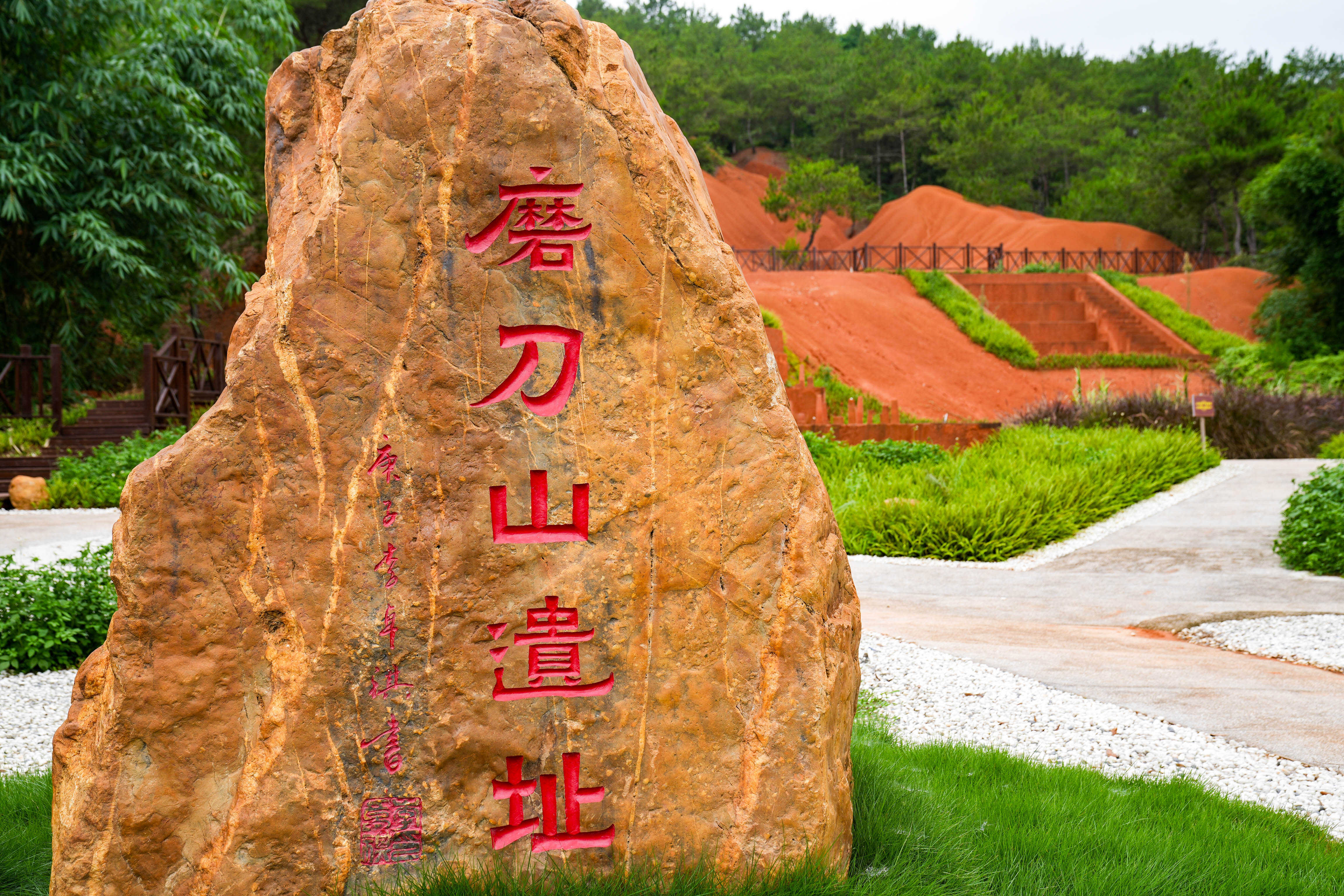 从广州出发,到达位于云浮市郁南县河口镇的磨刀山。葱茏的山林间,伴随着蝉鸣阵阵,一大片裸露的红色山坡出现在半山腰处,这里就是磨刀山遗址的位置了。