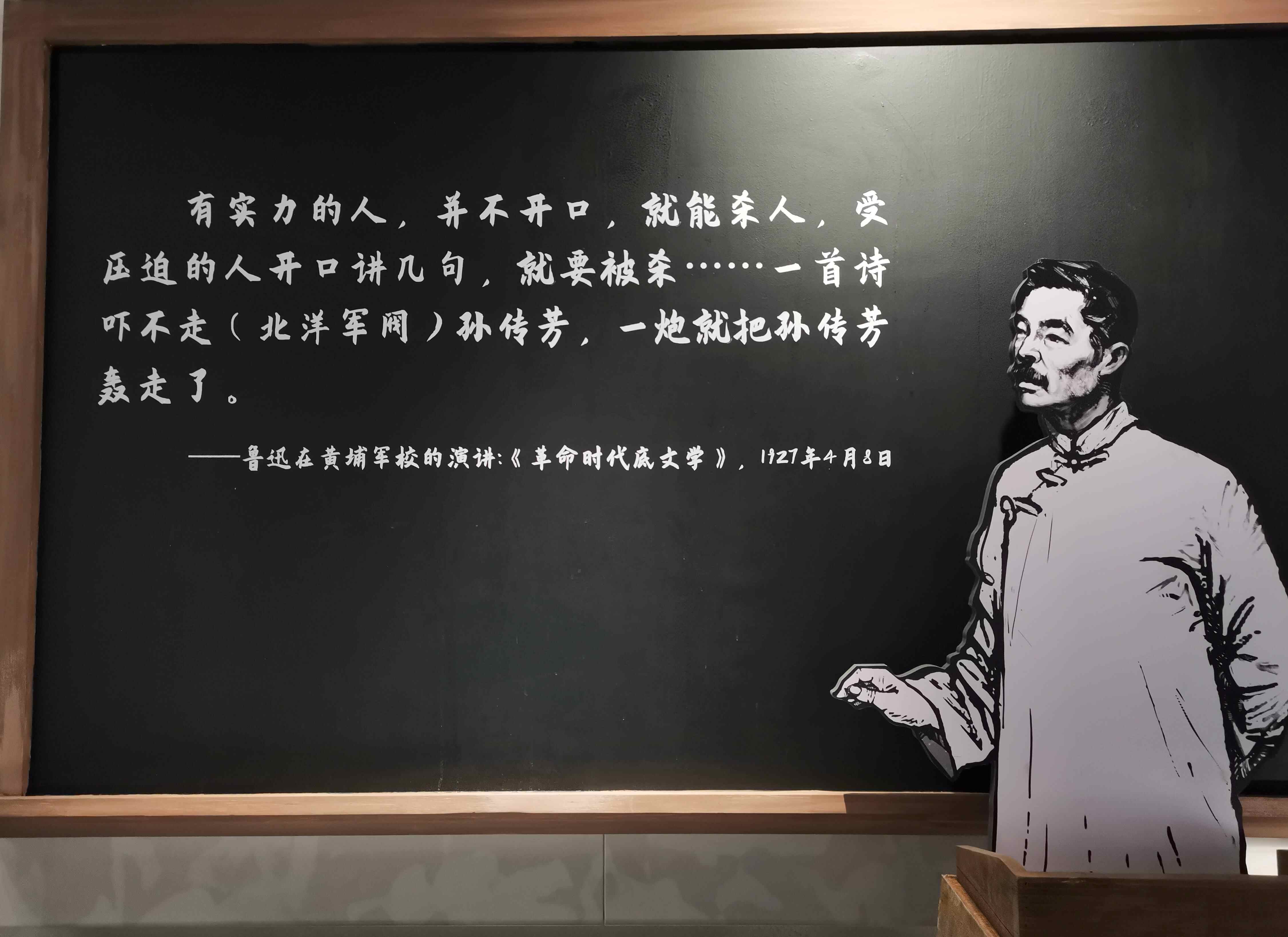 此外,鲁迅也于1927年4月8日被邀请到黄埔军校作《革命时代底文学》的演讲。他在演讲中说道:“有实力的人,并不开口,就能杀人,受压迫的人开口讲几句,就要被杀……一首诗吓不走(北洋军阀)孙传芳,一炮就把孙传芳轰走了。”