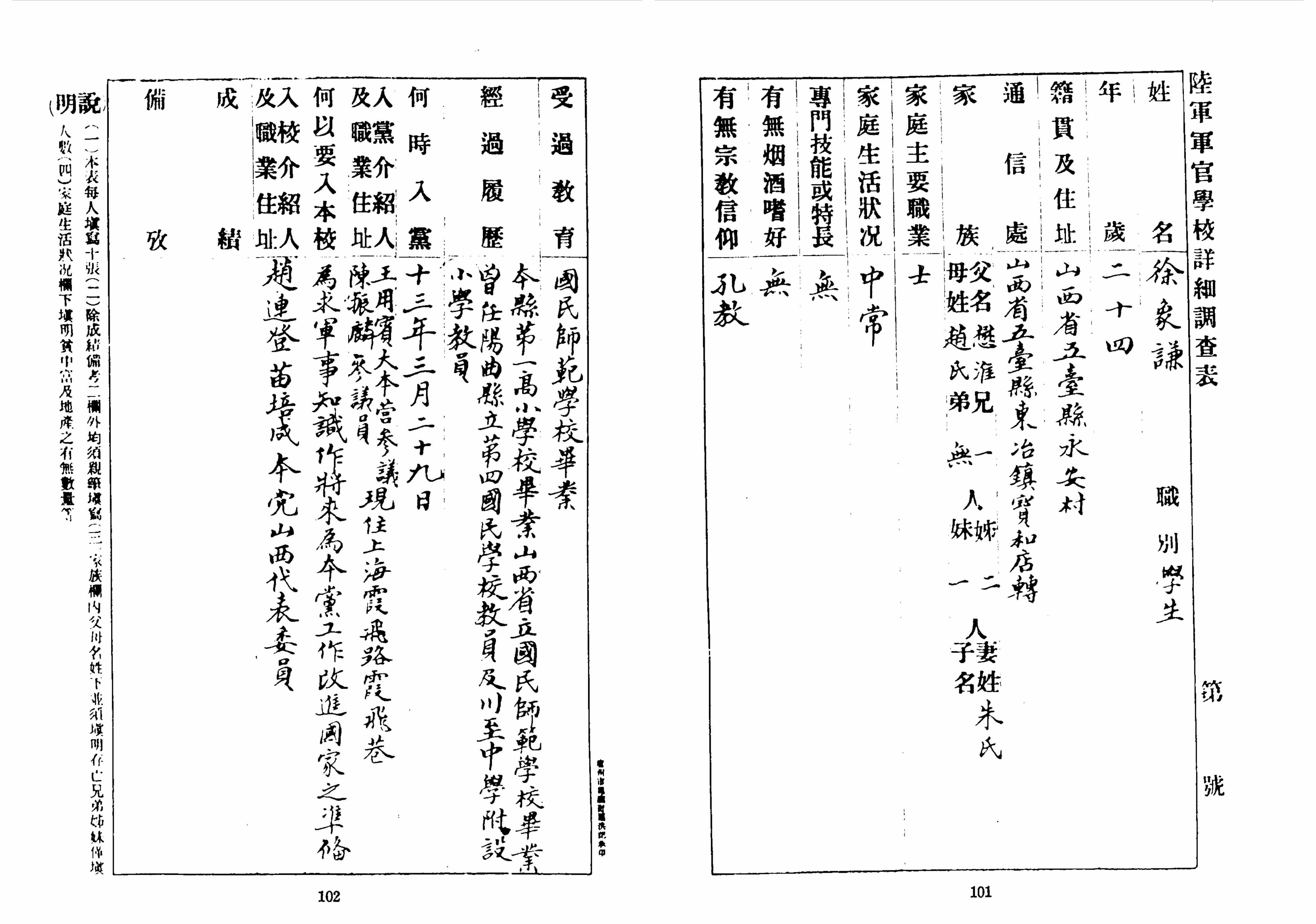 徐向前填写的《陆军军官学校详细调查表》