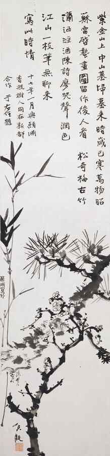何香凝、陈树人、经亨颐合作画《松竹梅》,1928年作,于佑任题款(何香凝美术馆供图)