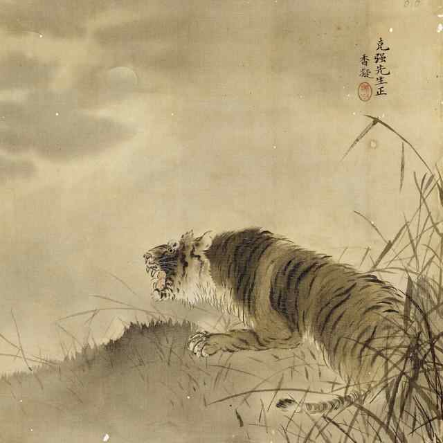 在此期间,何香凝开始以狮虎为绘画的主要题材。虎画是何香凝赠礼画中具有代表性的题材。1910年的《虎》是何香凝现存最早的作品之一,她将其赠与革命先驱黄兴先生。画面中老虎置身于杂乱草丛,呈现匍匐姿态,蓄势待发,威猛之势逼出画外。