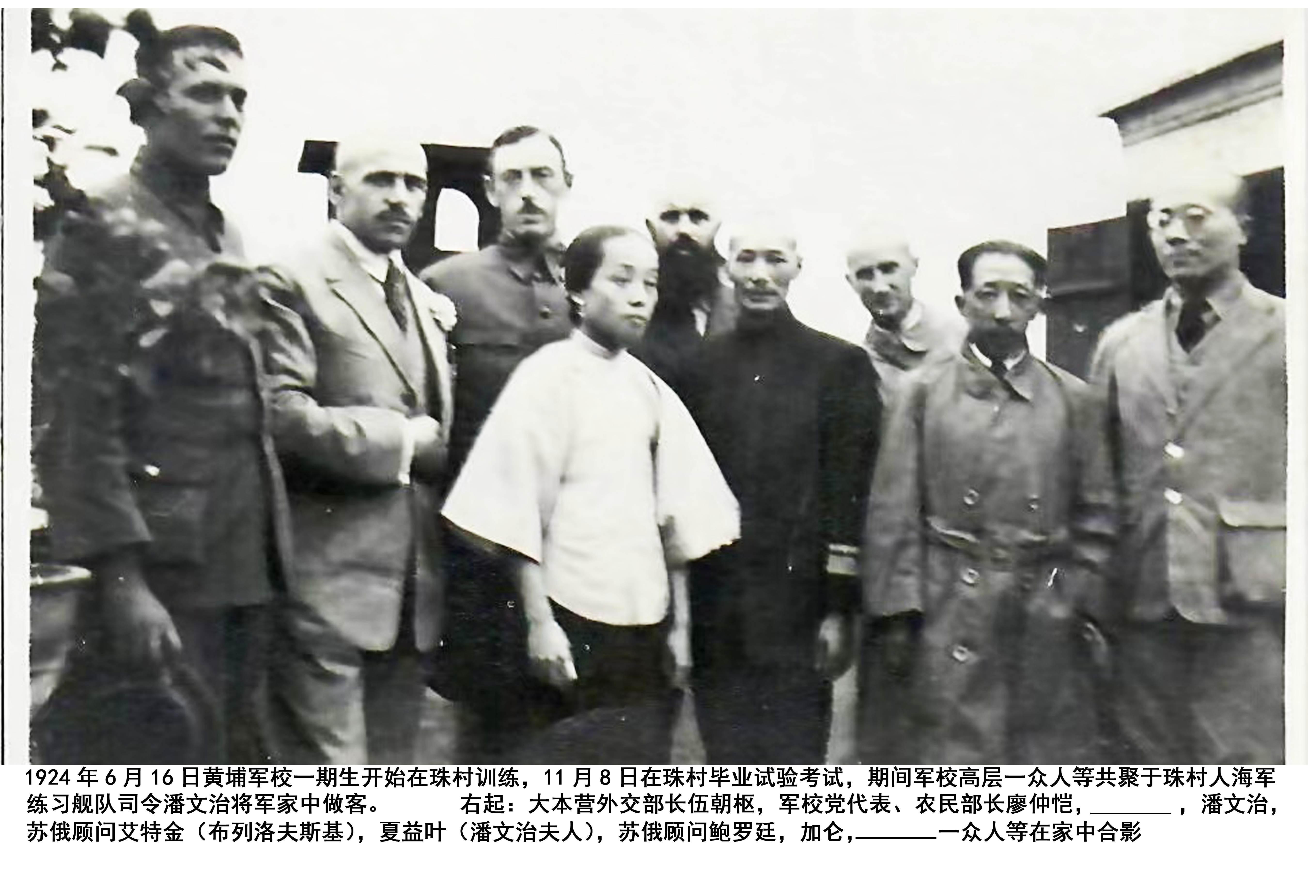 民俗专家潘剑明就是土生土长的广州珠村人,今年,他从历史学者陈重阳那里见到一张珍贵旧照——当时黄埔军校党代表、农民部长廖仲恺,黄埔军校的苏联顾问鲍罗庭、加伦等人,与潘文治、夏益叶夫妇的合影。