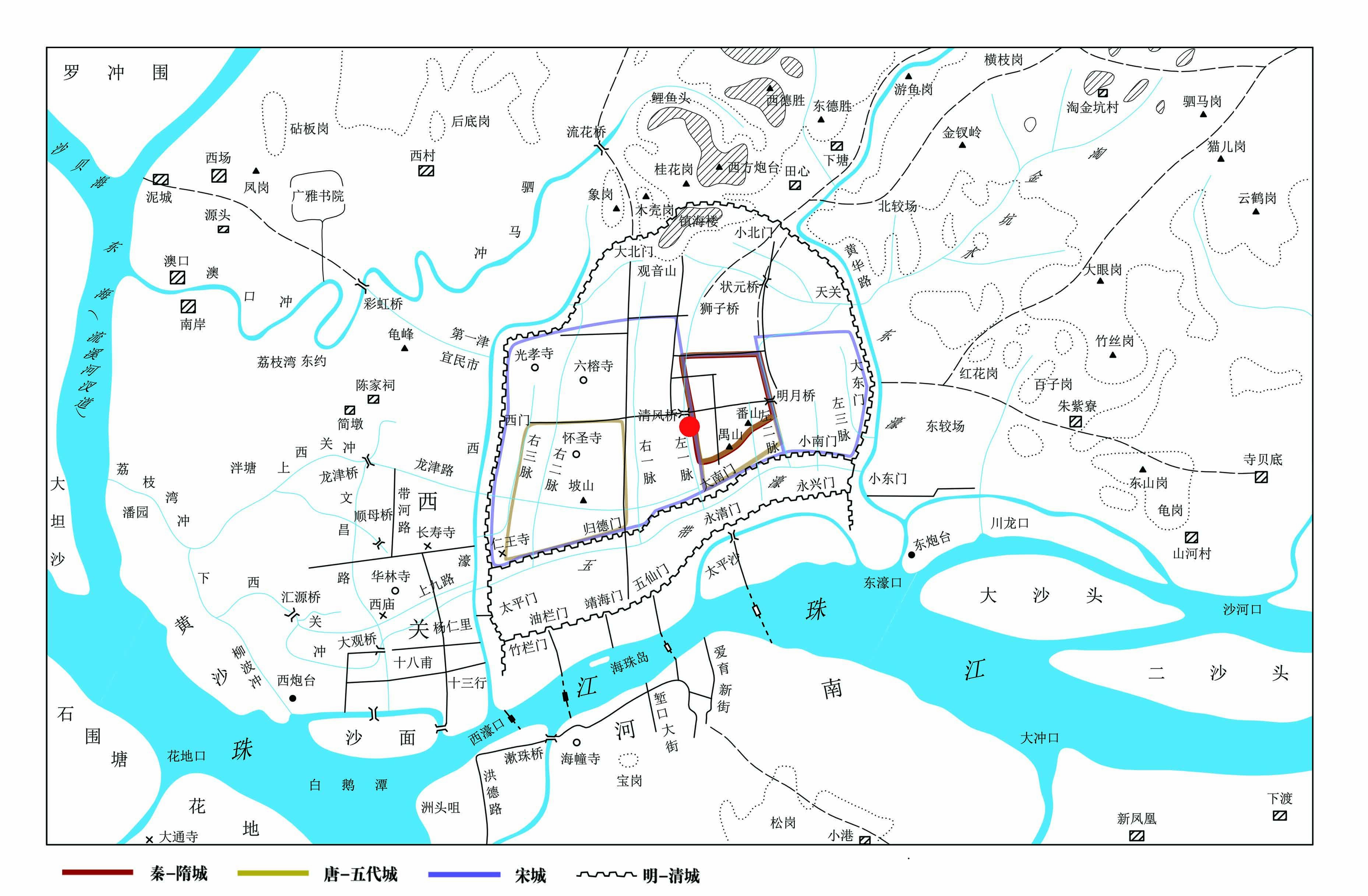 广州古城北倚越秀山为屏,南临珠江设水闸控潮蓄洪,东西两侧受甘溪古河道东西二支自然切割——负山襟海、两水夹持的格局,城市空间被“锁定”在了由番山禺山高地所形成的天然半岛内(周长约2800米,范围大致在今旧仓巷-大塘街以西、华宁里-流水井以东、西湖路以北、越华路以南,面积约0.4平方公里),宫署核心区则踞守高地。在这里,甘溪河道既成为护卫都城的天然堑壕,客观上亦充当了制约城市扩张的地理界标。