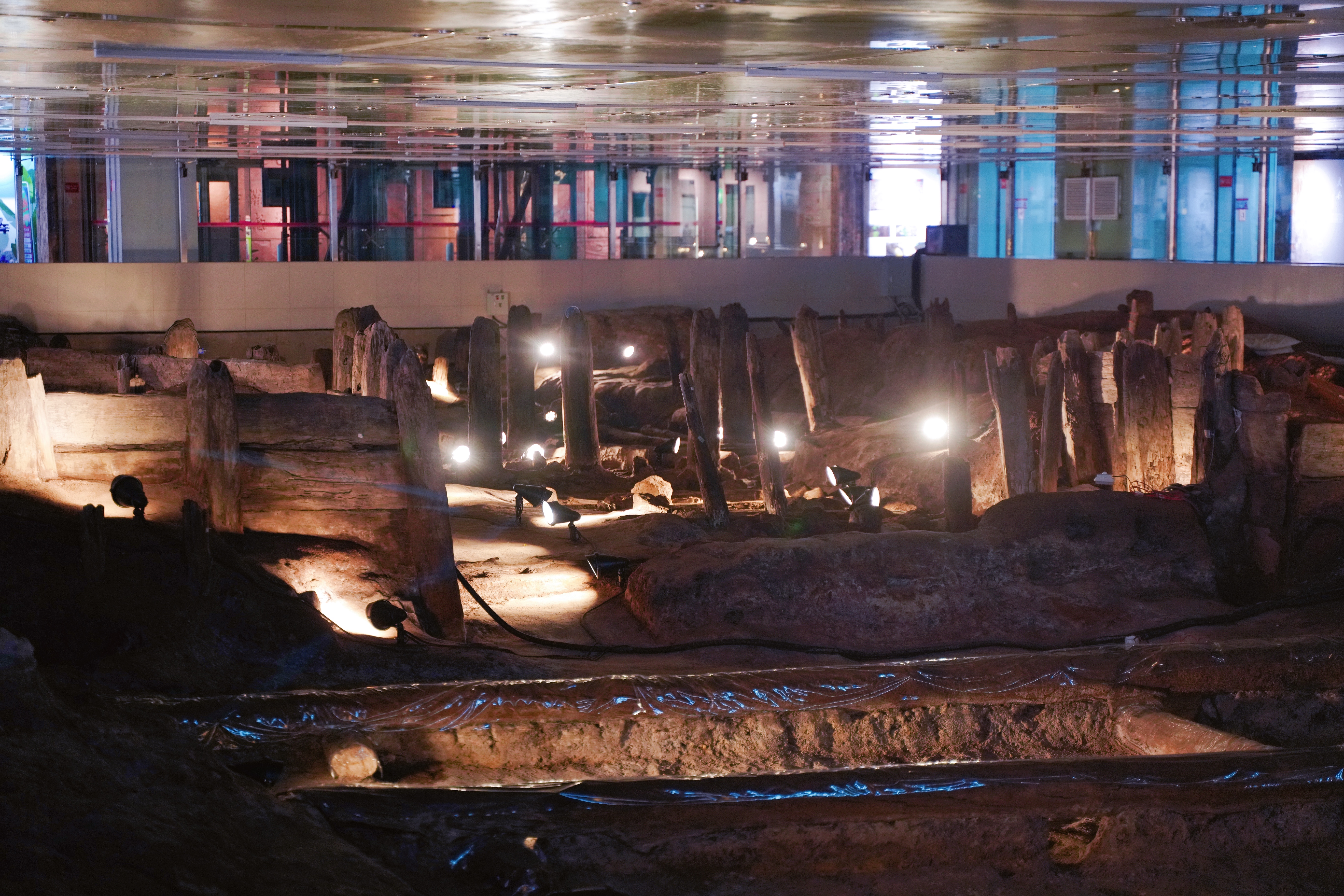 位于广州光明广场负一层的南越国木构水闸遗址/新快报记者 郭思杰 摄