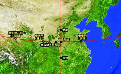 今年三月,我们出版了《宇宙考古学的邀约:通过卫星数据解读埃及与中国文明》。书中运用卫星影像探讨了始皇帝陵、长城、咸阳城、秦东门、秦山岛等遗址。此次得知石刻发现的消息,我第一时间拜托了专攻卫星影像分析的惠多谷先生,请他在地球半球卫星图上标示出石刻地点,并绘制秦代的东西轴线。始皇帝陵的墙壁与坟丘等皆依照秦代的南北轴线与东西轴线建造(比现今子午线偏东约1.4度,是根据当时北极星位置测定而来),东西轴线亦与现今略有不同。若据此将地轴稍东倾做修正,标注石刻位置并绘制东西线,则“采药昆仑”石刻向东与始皇帝陵、洛阳城、秦东门(江苏省连云港)精准地呈现一字排列,堪称令人惊叹的奇观。