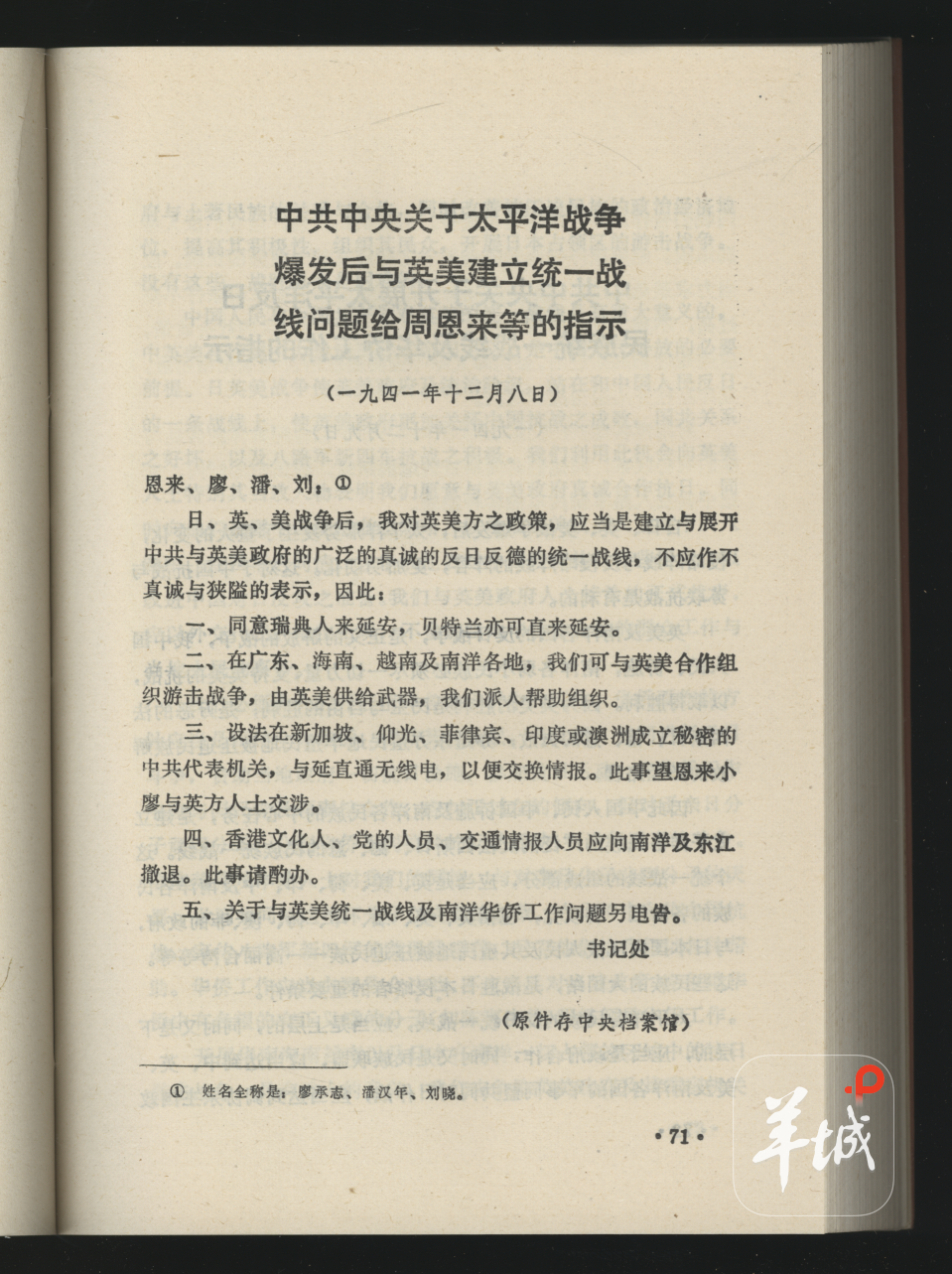 1941年12月8日,中共中央书记处急电周恩来、廖承志、潘汉年等,要求“香港文化人、党的人员、交通情报人员应向南洋及东江撤退”