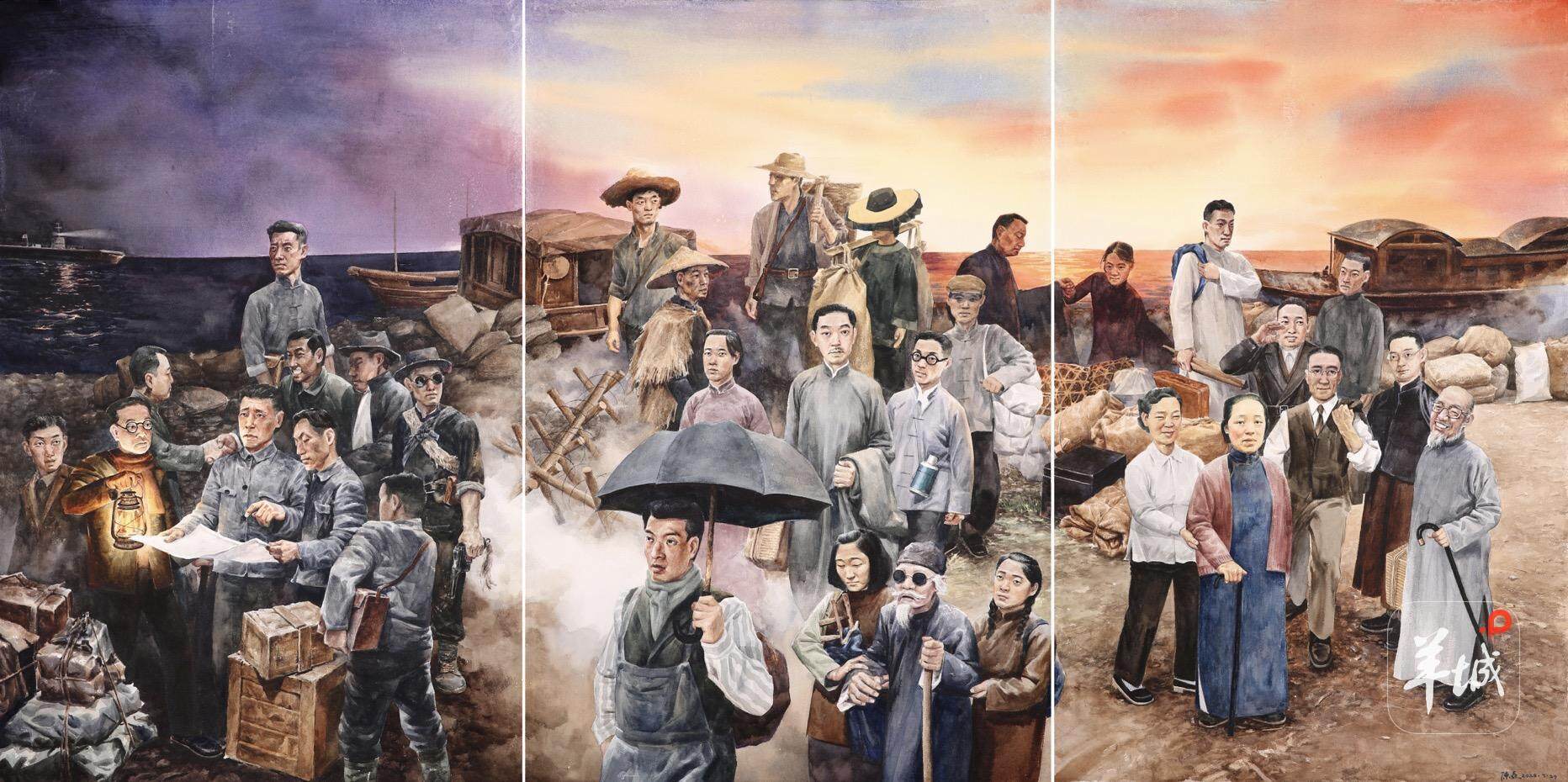 画面中联,茅盾、邹韬奋等人的眼神坚毅,充满信任,正乔装打扮成“难民”,跟随打着黑伞的联络员,跨越重重封锁。画面右联,天色渐亮,何香凝、柳亚子、夏衍等人的面容浮现出欣慰的笑意,象征着文化名人胜利抵达大后方的情景。