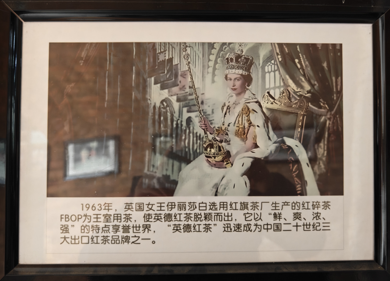 1963年,英德红茶在英国伦敦茶叶拍卖会上成功拍出,成为外销“明星”。不久,广东省茶叶进出口公司便从中国驻英国大使馆电文中获悉:“1963年英德红旗茶厂所产的红碎茶FOP(叶茶一号),被英国女王伊丽莎白二世选为宴宾用茶,并受到高度的称赞和推崇。”