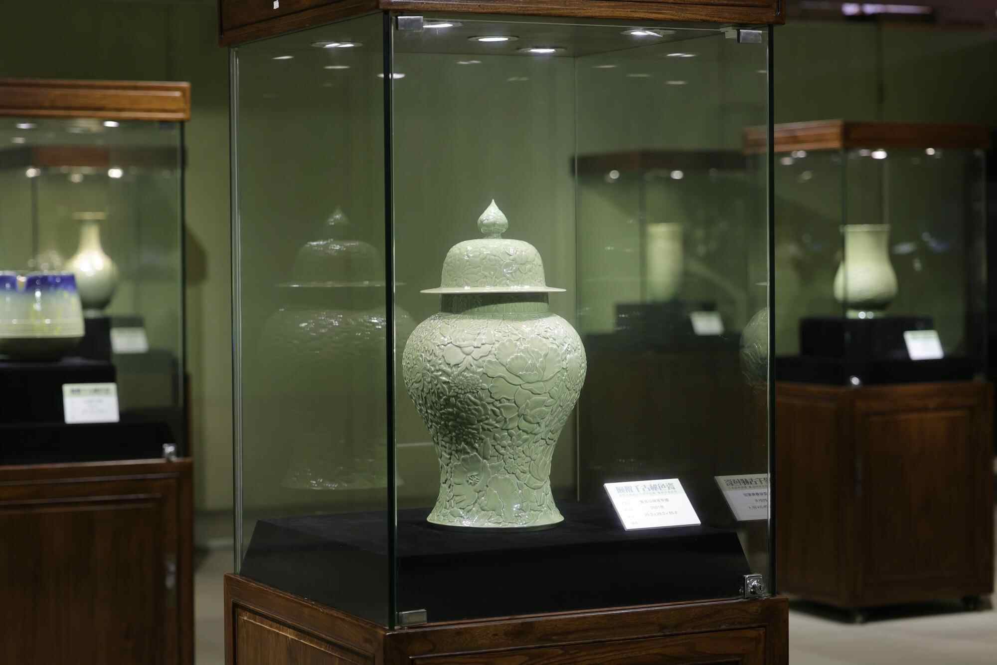 据介绍,这次展览是施珍从事越窑青瓷创作和传承工作三十余年来在广东首次推出的个人作品展。展览以“唤醒千古秘色瓷”为主题,展出了施珍所创作的花瓶、盘、茶具等60件(组)越窑青瓷精品,包括代表作品《上林随想》《上林秘色——法门瓷缘》《吉祥鸟双耳瓶》《英武神勇——五瓣葵口秘色盘》《上林秋色》等。