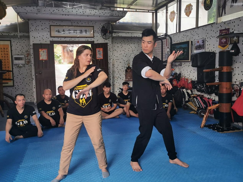 鹤山古劳咏春第五代传承人冯家辉(右)教授洋弟子(通讯员朱强 谭耀广 供图)