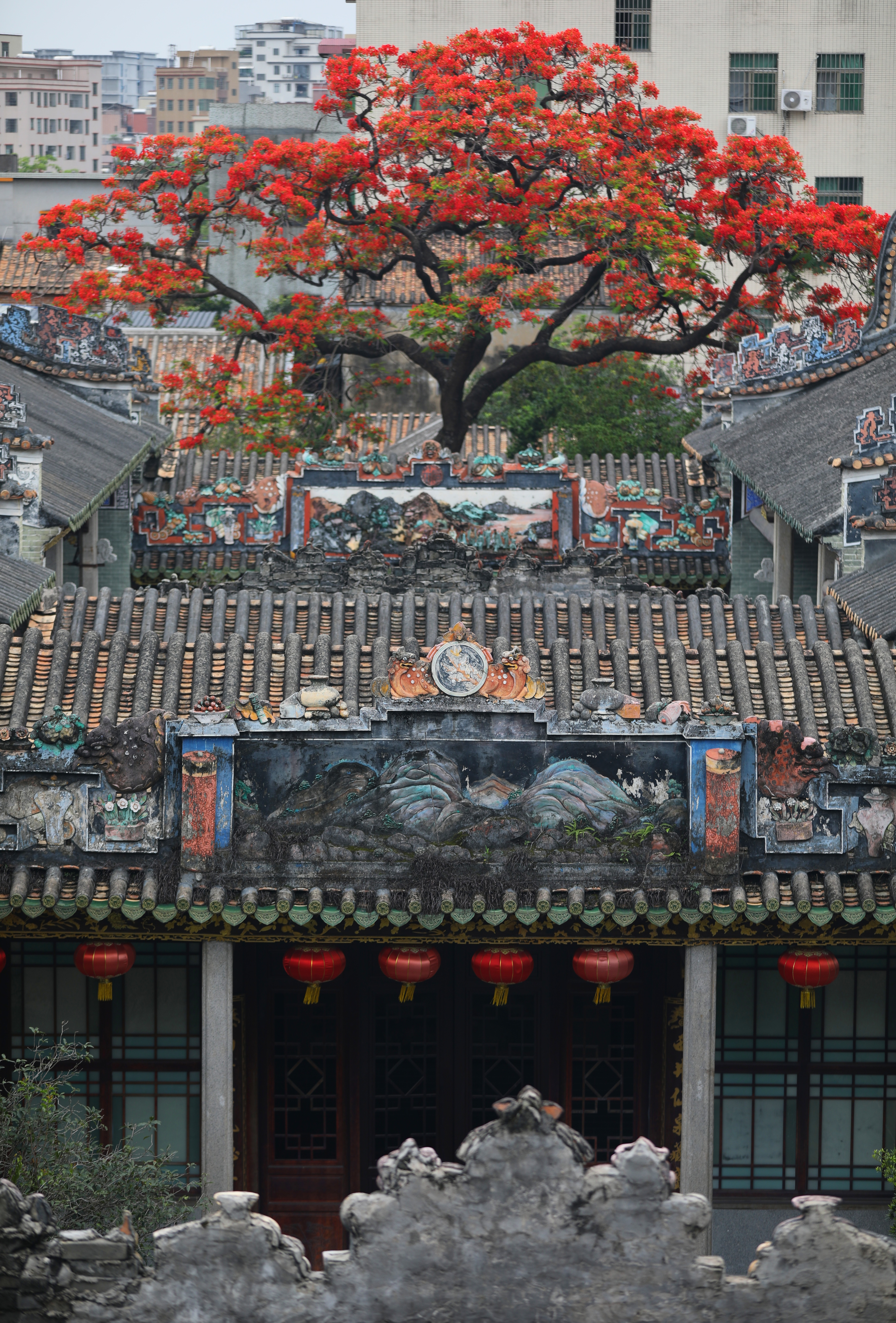 不久前的五月,怒放的凤凰花映红百年古祠的照片在广州市民的朋友圈刷屏。照片中,灿若红霞的花朵与青砖灰瓦的岭南建筑相互映衬,形成一道独特的南国风景。