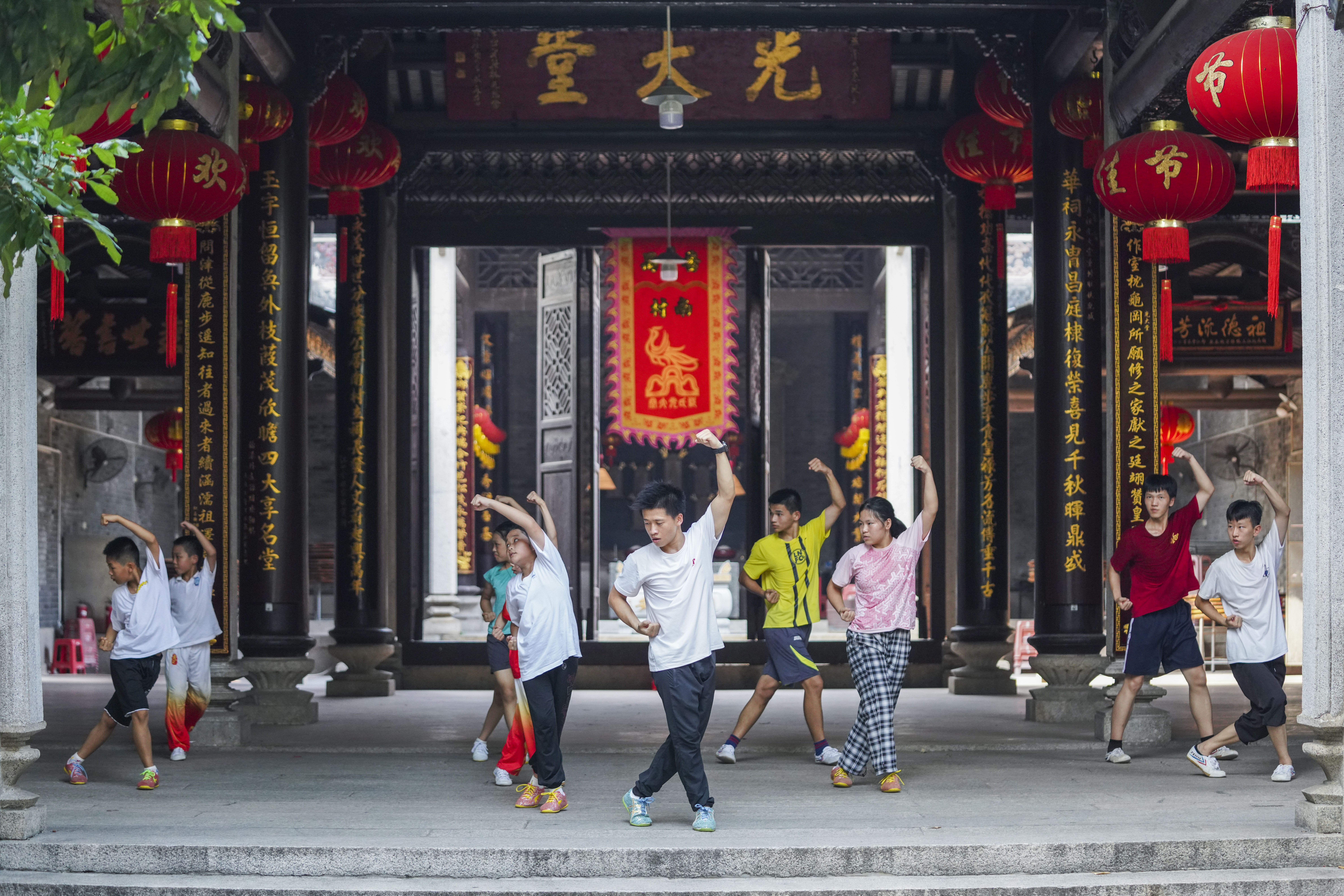 番禺区南村村邬氏大宗祠,一群少年在祠堂练习武术,背后是祠堂里的牌楼 宋金峪 摄