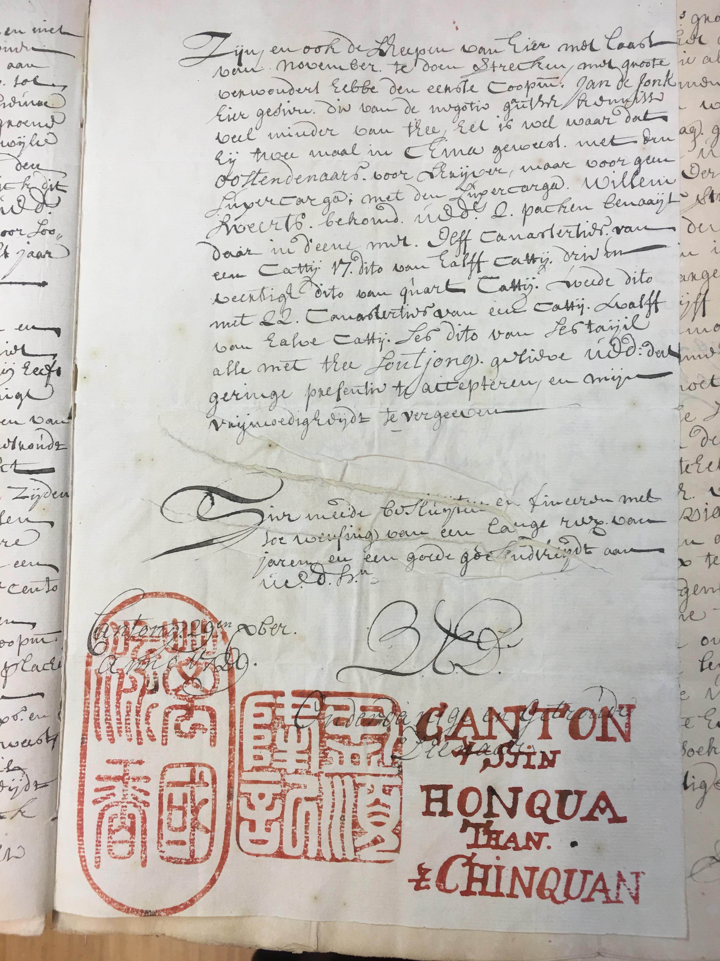 例如,荷兰国家档案馆(位于海牙)收藏了丰富的广州十三行商贸文献,其中包括清雍正七年(1729)广州十三行商陈芳官、陈钦官与荷兰东印度公司签订的茶叶商贸文件。该文件不仅盖有中文印章“盈顺隆记”与荷兰文印章“CANTON Sjin HONQUA THAN CHINQUAN”;还加盖了一枚广告印章,印文为“万国流香”。这应是目前所见中国最早的海外茶叶广告,生动反映了通过广州十三行,神奇的小小茶叶承载着中华文明,成为中西物质与文化交流的重要媒介。中国茶叶以其绝佳品质,使香气与美名流传万国,吸引世界各地的仰慕者前来寻访、品鉴与贸易,深刻影响了世界社会的生活方式及相关制度的变迁。