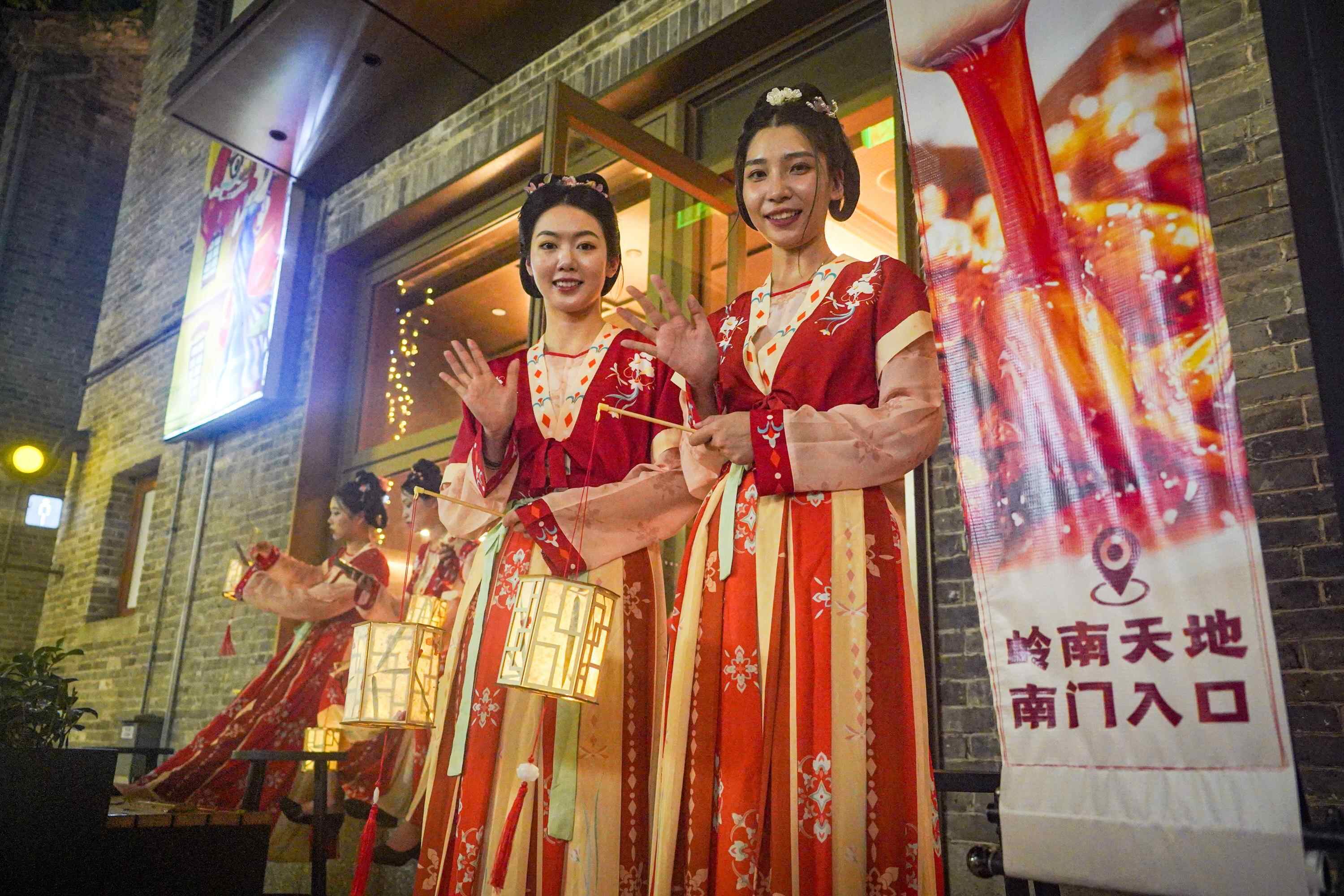 佛山岭南天地汉服小姐姐向来往的游客打招呼 记者贺全胜 摄
