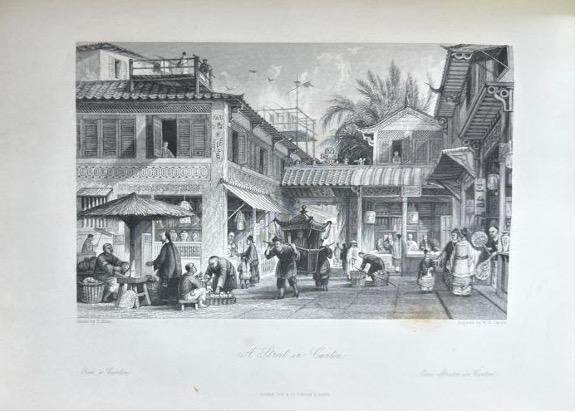 其中,一幅名为“A street in Canton”的版画描述了当时广州中心一条繁荣商业街道的景象——地面铺有宽敞花岗岩石板,两旁房屋数量众多,商铺门窗敞开,商品露天陈列,店面通常会有显眼标志并悬挂灯笼。