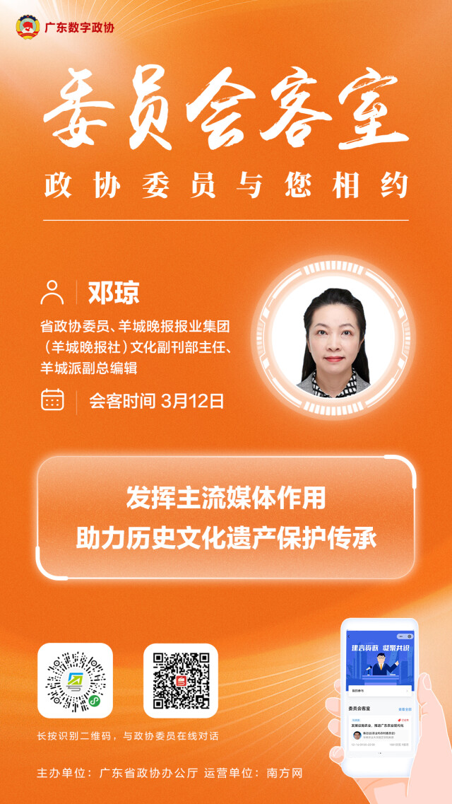 历史悠久的岭南园林、中西交融的开平碉楼、巧夺天工的潮州木雕……一个个文化遗产承载着中华民族的文化基因,也是连接民族情感的精神纽带。近年来,广东省政协与羊城晚报联合打造《岭南文史》专栏,推出系列深度报道,不仅“唤醒”沉睡的文物,更以多元表达将文化遗产融入当代生活图景。新时代,主流媒体正以高度的文化自觉与创新的传播手段,成为文化遗产传承保护的呼吁者和践行者。今天,省政协委员、羊城晚报报业集团(羊城晚报社)文化副刊部主任、羊城派副总编辑邓琼,与您聊聊“发挥主流媒体作用,助力历史文化遗产保护传承”这个话题。