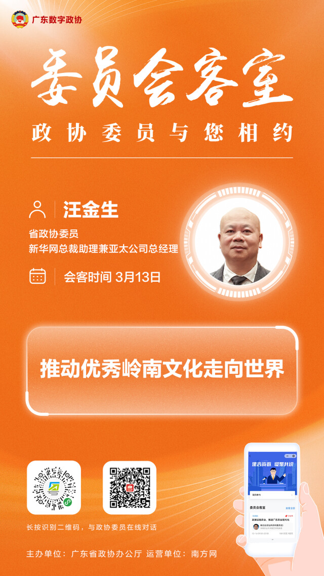 激昂豪迈的英歌舞“出圈”海外,威武的南狮频频走出国门,技艺精湛广彩瓷器在欧美市场大放异彩。岭南文化,汇聚了中原文化的深厚底蕴与海洋文明的开放活力,自古以来就以开放包容、勇于创新著称。如今,乘着共建“一带一路”与粤港澳大湾区建设的东风,岭南文化正以生机勃发的姿态,跨越山海,与世界各地的文化进行深度交流融合,搭建起连接东西方文明的桥梁。今天,省政协委员,新华网总裁助理兼亚太公司总经理汪金生与您一起探讨“推动优秀岭南文化走向世界”这个话题。