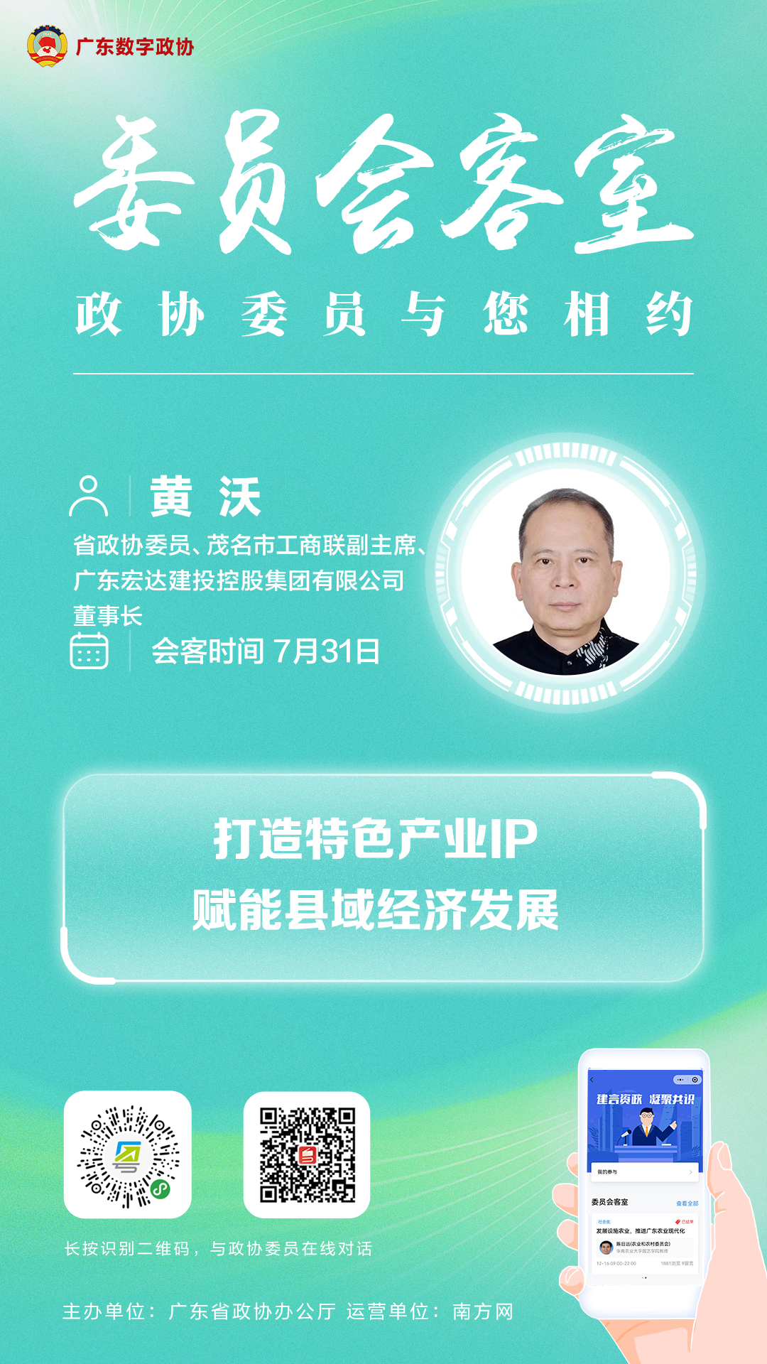 近年来,广东不少地区因地制宜、大胆探索,积极打造赋能县镇区域经济发展的产业IP。潮州潮安“糖果小镇”以百年食品工业为基底,打造集生产、文旅于一体的产业生态,吸引全球客商目光;茂名羊角镇通过“花生IP形象”创意设计大赛,让传统花生产业焕发时尚活力,助力打造“花生强镇”;阳江阳春以“香云纱+蚕桑”非遗IP为纽带,实现“种养加销旅”产业链五环联动,推动万亩桑园与文旅消费深度融合……特色产业IP不仅是县域经济的“金字招牌”,更是带动群众增收致富的“动力引擎”。今天,省政协委员、茂名市工商联副主席、广东宏达建投控股集团有限公司董事长黄沃,与您聊聊“打造特色产业IP,赋能县域经济发展”这个话题。